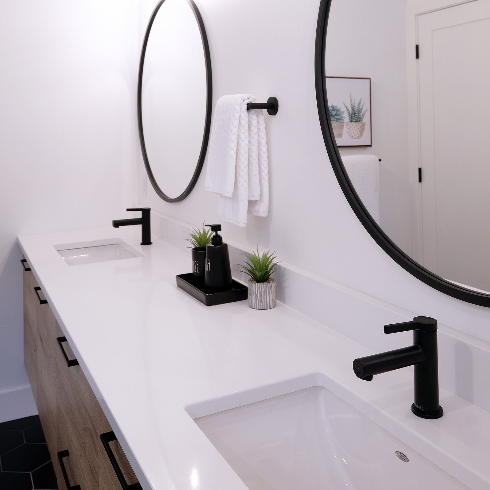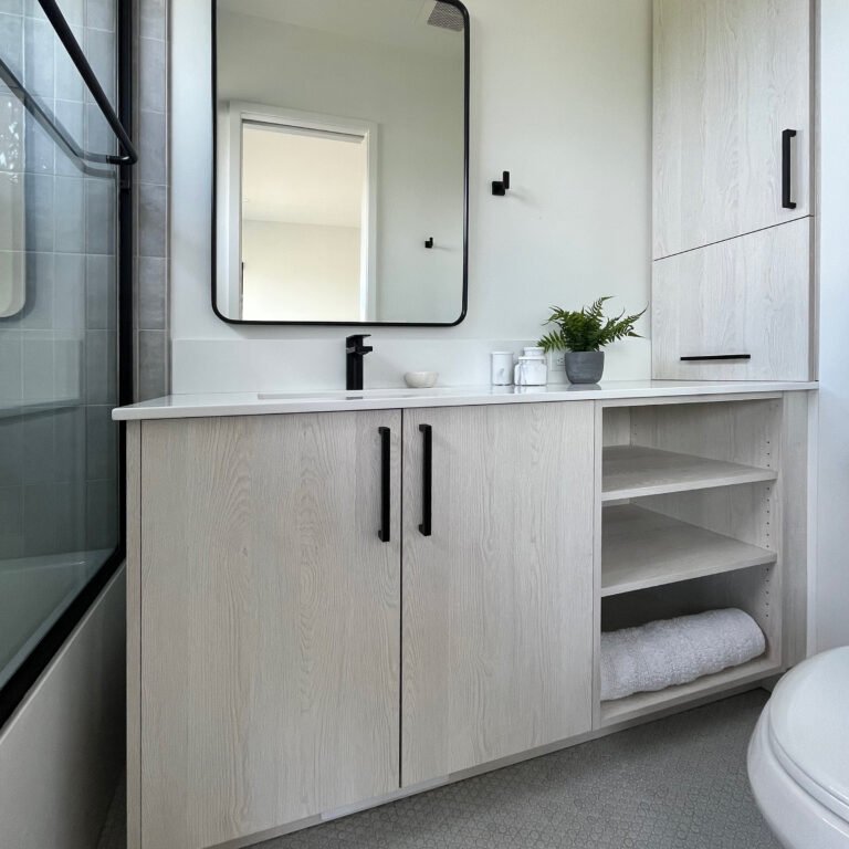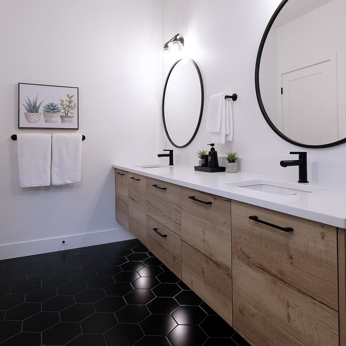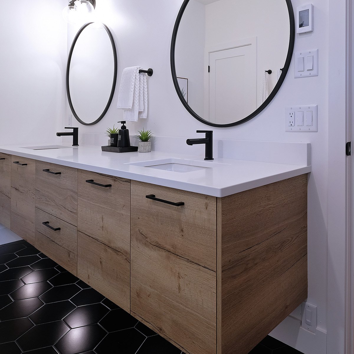 Modern bathroom vanities have a clean profile. Embracing simplicity is not only budget conscious but it’s design-forward. With custom sizing, drawer configurations, and finish options, these vanities can be designed to fit neatly into compact layouts, accommodate double sinks, maximize drawer storage, and more. The result is both polished and practical.