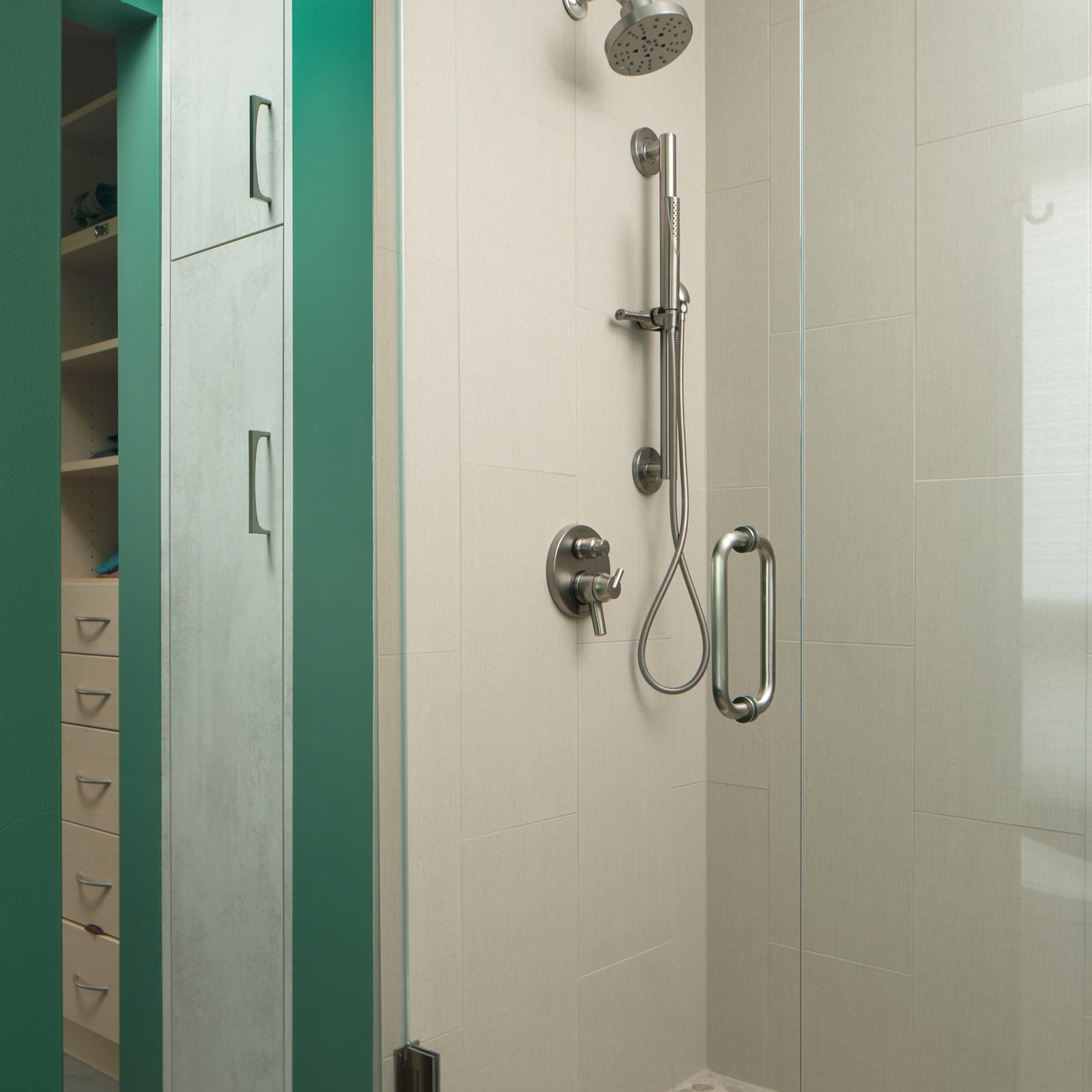 For a retired couple settling into condo living, this warm bathroom was designed to prioritize comfort and everyday ease. As both the main bathroom for the condo and his primary bath, it needed to balance accessibility with everyday function. With recent knee surgery in mind, the layout includes a floating vanity for better mobility and a walk-in shower that’s simple to step into.