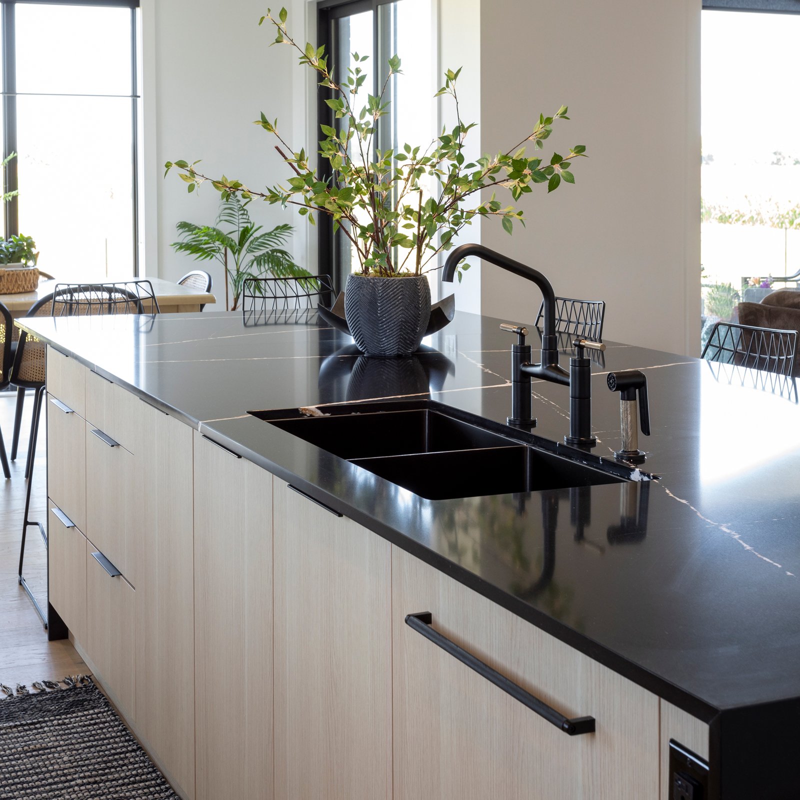 This space brings warmth, light, and functionality together in one cohesive design. Durable Sand Lyon Ash TFL offers the look of natural wood with easy-care performance, while Alpine White UV-lacquer cabinetry adds contrast and a smooth, wear-resistant finish. Sleek Novablack toe kicks ground the space and brings the appliances into the design.